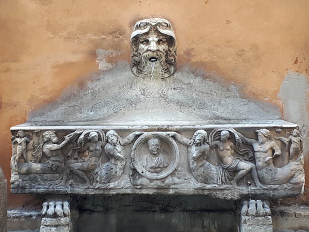 Designed by Antonio Sarti in 1842, the fountain is made up of an ancient marble Roman sarcophagus supported by two mighty lion paws. The front of the sarcophagus is decorated in bas-relief with tritons and nereids arranged symmetrically around a central medallion with a togaed man. The water is poured like a fan from a superimposed mask and then comes out through two spouts inserted at the base of the sarcophagus, collecting in a semicircular marble basin protected by columns.