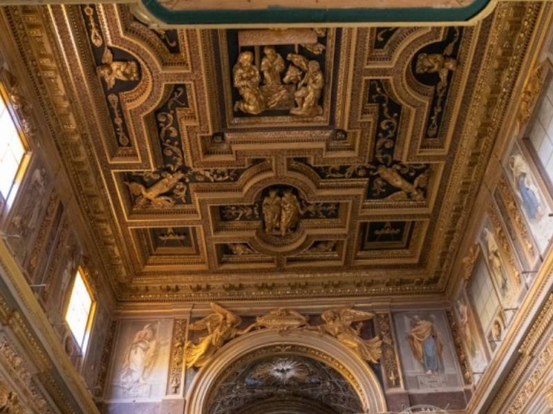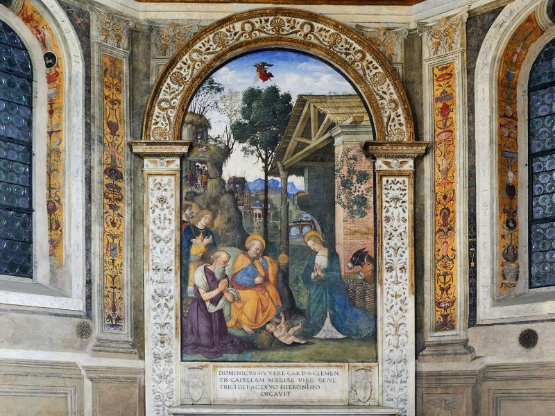 Bernardino di Betto Betti, bekannt als Pinturicchio, schmückte zwischen 1488 und 1490 die Geburtskapelle – auch Della Rovere-Kapelle genannt – der Basilika Santa Maria del Popolo an der Piazza del Popolo. Im Herzen des raffinierten Freskos, unter dem blauen Sternengewölbe der stimmungsvollen Umgebung, ist die heilige Familie zusammen mit dem Heiligen dargestellt, in der Nähe der Hütte, mit den anbetenden Hirten auf der rechten Seite und dem Ochsen und Esel auf der linken Seite. Im Hintergrund eine vom Morgenlicht beleuchtete Landschaft, darüber ein Engel, der die Ankunft der Heiligen Drei Könige ankündigt. Die Basilika, eines der bedeutendsten Bauwerke der römischen Renaissance, beherbergt zahlreiche Kunstwerke und Grabmäler wie die Chigi Kapelle, die von Raffael entworfen und von Gian Lorenzo Bernini vollendet wurde, und die Cerasi Kapelle mit Meisterwerken von Caravaggio und Annibale Carracci.