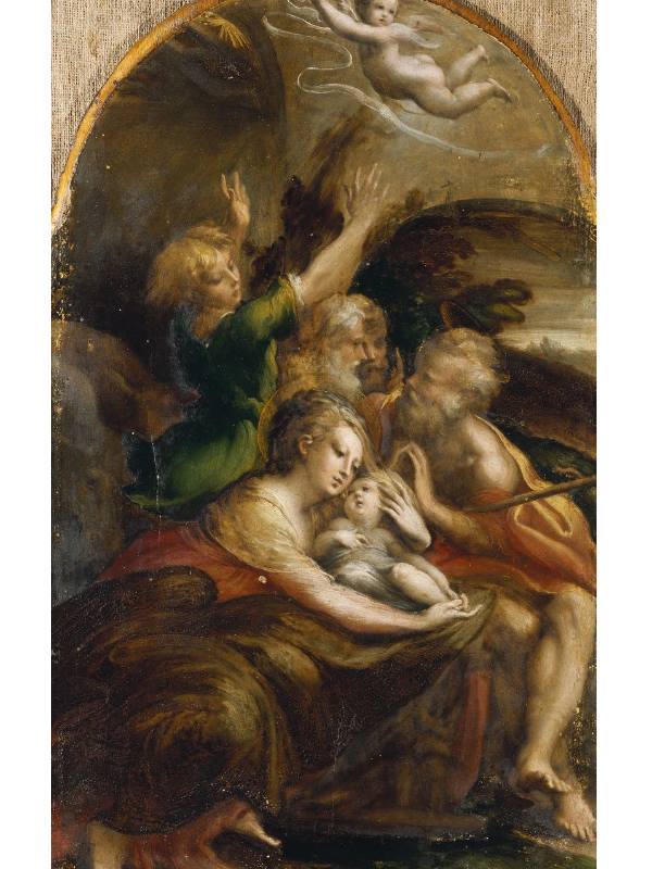 Die nuancierten Pinselstriche und die lebhaften, dichten Farben sind die Merkmale dieses prächtigen Gemäldes, das der Maler aus Parma im Jahr 1525 ausführte. Die Heilige Familie ist in einer Hütte mit einem offenen Gewölbe dargestellt. Wir haben Maria, die ihren Sohn liebevoll hält, und Josef, der anbetend, aber mit dem Blick auf das Kind gerichtet, seine Arme in Richtung eines kleinen Engels hebt. Im Hintergrund sehen wir zwei ältere und bärtige Personen, die sich über das Ereignis zu unterhalten scheinen. Das Werk bildete ein Diptychon mit der „Madonna mit Kind“ und wird in der Galerie Doria-Pamphili aufbewahrt, im gleichnamigen prächtigen Palast in der Via del Corso, der seit Jahrhunderten eine Privatsammlung mit Meisterwerken von Künstlern des Kalibers von Caravaggio, Tizian, Raffael, Carracci, Bernini und Velázquez beherbergt.