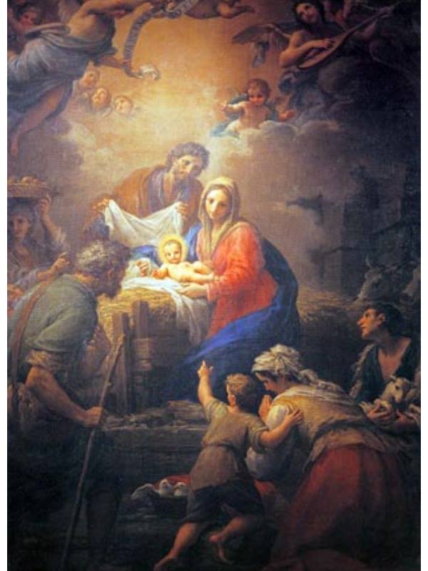 In der Geschichte der Kirche von Rom hat die Basilika Santa Maria Maggiore einen wirklich aufregenden Ursprung: sie ist in der Tat mit der Legende des Schneewunders verbunden, die jeden 5. August in Erinnerung gerufen wird, und ist die einzige Basilika, die ihre frühchristliche Struktur bewahrt hat. Neben der suggestiven Krippe von Arnolfo di Cambio beherbergt sie Kunstwerke von unermesslichem Wert. Darunter das schöne Gemälde von Francesco Mancini, das die Geburt Christi darstellt. Die warmen und einnehmenden Farben und der typisch barocke Stil kennzeichnen dieses Gemälde von 1750: die Heilige Familie schaut nach außen und am Fuße der bescheidenen Krippe, die mit Heu bedeckt ist, gibt es einige Hirten im Gebet, darunter ein Kind, das dem Mutter das Kind Jesus anzeigt. Oben verkünden Engel freudig das Ereignis. Das Werk wird unter die prächtigen Mosaike von Jacopo Torriti in der Apsis der imposanten Basilika gestellt.