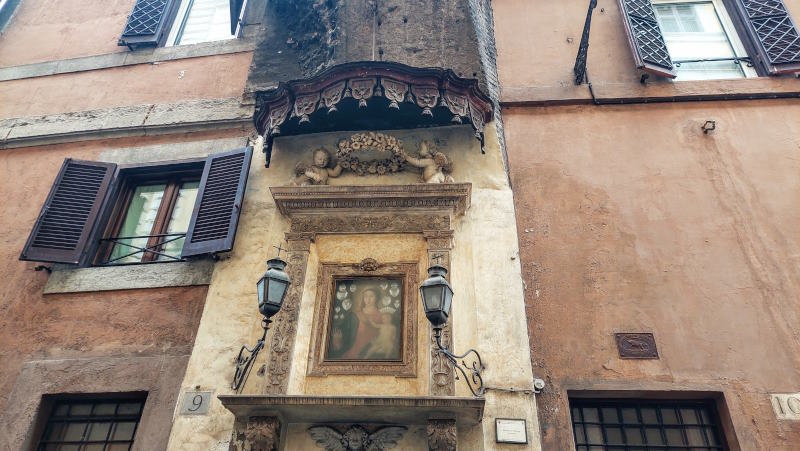 But the curiosities of the small street do not end there. Under the remnants of the “ciambella” a beautiful tabernacle houses a 19th-century copy of the “Madonna of the Rosary”. Considered miraculous and therefore revered, along with other Madonnelles in the city the holy image allegedly moved her eyes and shed tears for nearly 20 days between July and August 1796, in the imminence and inevitability of the French invasion of the Papal States. Complemented by a wooden canopy, a shelf with two lampposts and a kneeler, the ancient aedicule belonged to the Capparucci family, which celebrated a solemn feast in her honor here on the first Sunday in October by adorning the image with myrtle branches, lights and streamers. At the end of the 19th century, when the family moved away, they took the image with them, and since then all trace of it has been lost. The copy now displayed in the shrine was commissioned a few years later by a local carpenter from the painter Pietro Campofiorito, and represents the Madonna holding the Child and a rosary in her right hand.