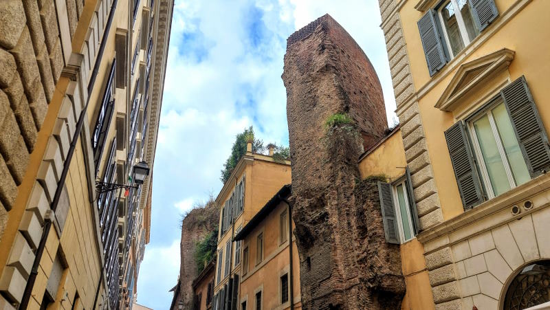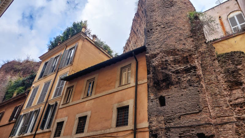 Back to our little street: as we lift our gaze, behind a couple of houses that hide it and lean against it we can see an extensive Roman ruin, about 10 meters high. It is almost all that remains of the baths, a portion of what was probably the calidarium, a domed covered circular hall about 25 meters in diameter that was the center of the whole complex. The opening of the street in 1542 cut the circular building exactly in half. However, the hall still remained almost intact until the early 17th century, as prints and sketches show us. Because of its shape, Romans familiarly called it “Rotulo”, “Tondo”, “Torrione”, or, indeed, “Ciambella”, a name attested since the early 16th century. Urban development work in the area ordered by Pope Gregory XV in 1621 proved fatal for the ancient ruins: an engraving by the Dutch painter Bonaventura van Overbeek, dated 1708, shows that the building and the archway that allowed its passage had by then been almost completely demolished, leaving the street free of obstructions more or less as it appears to us now.