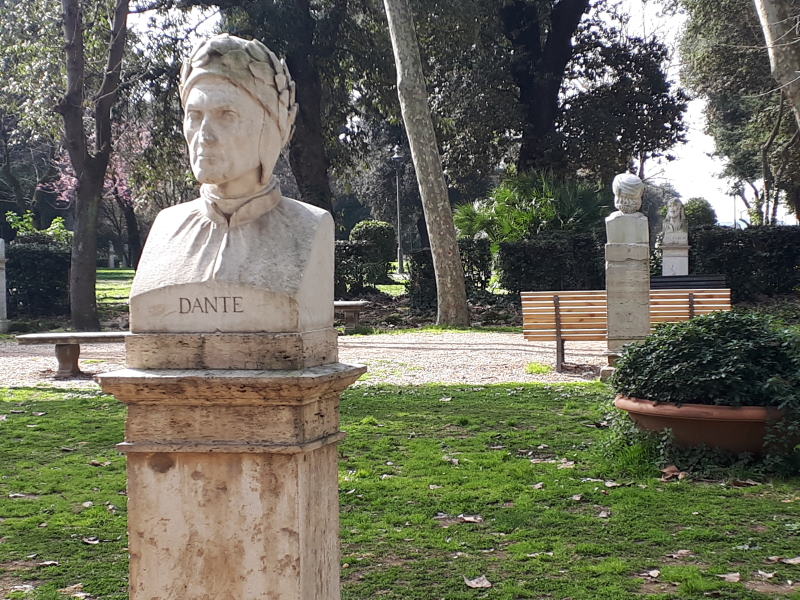 Logic says the monument to the father of the Italian language should be in the Roman square named after him, that is, Piazza Dante, born in the 1920s in the Esquilino district: indeed, it was planned but never made. The same fate befell the Danteum, a large architectural memorial designed in 1938 to be built along Via dei Fori Imperiali, close to the Basilica of Maxentius. To pay an open-air homage to Dante, all that remains is the Pincio Promenade, the first public park to open in the city. Here, among centuries-old trees and fountains, there are over 200 illustrious men of our past observing us, making up one of the largest collections of commemorative busts in Europe. The idea was born in the years of the Roman Republic, with the intention of forming a national identity and conscience: among the first 50 busts created, Dante could not be missing. It was sculpted in 1849-1850 and then placed between Viale dell’Orologio and Viale degli Ippocastani, in good company with Giotto, Cola di Rienzo and other medieval famous names. This may seem like a small thing but read what Cesare Pascarella – with Belli and Trilussa one of the literary glories of the city – wrote: “Because those busts, before being busts, / Have once been all real men. / And what great men they were! Well over the average. / Envied and admired by the whole world!”.