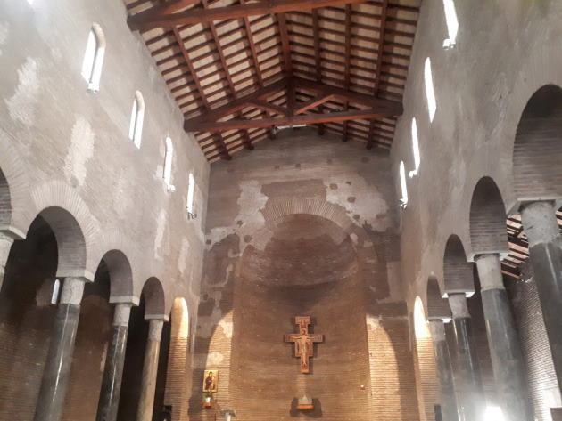 El interior, en gran parte rehecho, está dividido en tres naves por once columnas desnudas antiguas; el techo es de cercha de madera mientras que las paredes y el ábside están hechos de ladrillos expuestos sin ningún tipo de decoración. A la izquierda de la fachada hay un pequeño pero esbelto campanario románico del siglo XII. A pesar de las grandes renovaciones, todavía se reconocen grandes porciones de la mampostería original. Las excavaciones llevadas a cabo bajo la iglesia han dado lugar al fortuito e importante descubrimiento de muchos restos romanos.