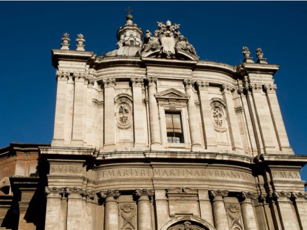 La facciata di travertino, leggermente convessa nel mezzo, è tra le opere più belle di Pietro da Cortona. La cupola è lievemente arretrata rispetto alla facciata e poggia su un tamburo circolare diviso da paraste in otto sezioni, con finestre a timpano e meravigliose cornici decorate con l’ape, simbolo araldico dei Barberini. L’interno, armonioso e monumentale con la sua profusione di fasci di pilastri e colonne ioniche, e austero nella sua bianchezza e candidezza, ha un’insolita pianta a croce greca: l’asse longitudinale è infatti più lungo di quello trasversale ma entrambi terminano con absidi leggermente schiacciati. Nei pennacchi della cupola sono presenti i simboli dei Quattro Evangelisti. La chiesa inferiore, che ospita il monumento funebre di Pietro da Cortona e opere di noti artisti del Seicento, tra cui Alessandro Algardi e Sebastiano Conca, è invece riccamente decorata da marmi policromi e ornamenti di bronzo. Dedicata a santa Martina, per disposizione testamentaria di Pietro da Cortona è amministrata dal Conservatorio di Sant’Eufemia, che ne è attualmente proprietario. La chiesa superiore, invece, aperta al culto, appartiene ancora oggi all’Accademia di San Luca.