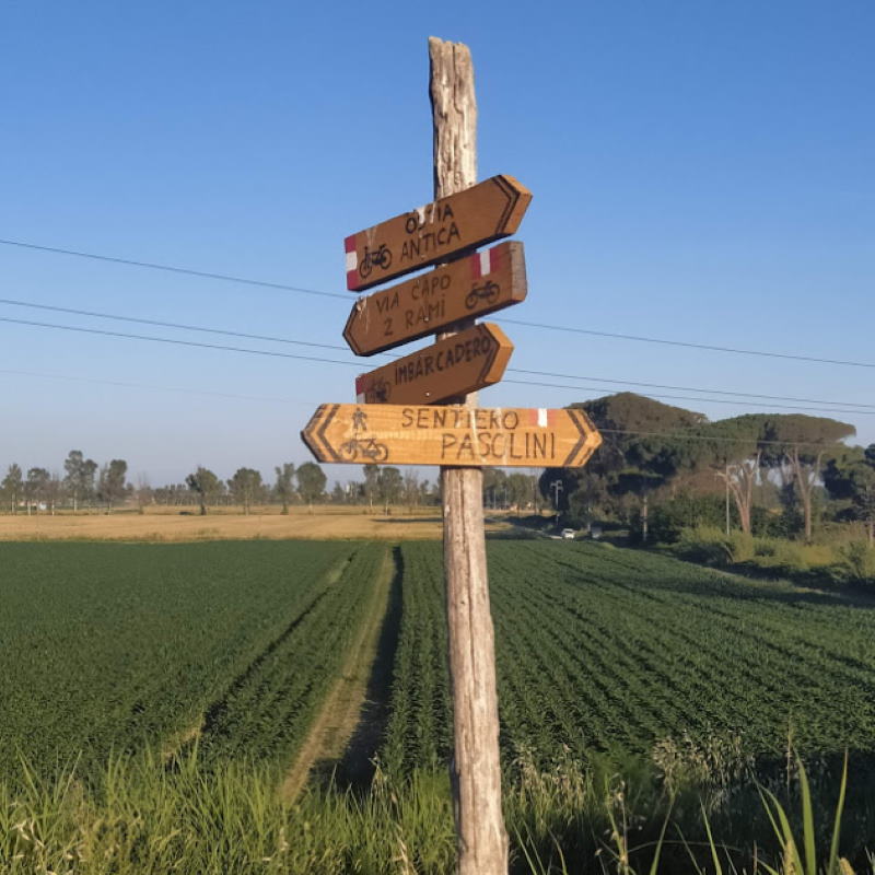 Appena al di fuori dell’area archeologica di Ostia antica e del Borgo, si distende la sterminata campagna ostiense. Oggi è una campagna ordinata, con appezzamenti regolari intervallati da strade bianche e percorsi da canali. Questa sistemazione è il frutto del lavoro di anni di persone che giunsero qui addirittura da Ravenna per bonificare il territorio: sono gli Scariolanti Romagnoli, cui Ostia antica è molto legata e dai quali discendono molti degli abitanti della zona. Armati di vanghe, di carriole e di grandissima forza fisica e d’animo, a partire dalla fine dell’Ottocento gli Scariolanti bonificarono un territorio che da malarico divenne estremamente fertile, oggi un polmone verde posto tra il Tevere, il mare e Roma. Su questo territorio si innesta uno splendido percorso ciclopedonale: è il Sentiero Pasolini, che parte proprio da Ostia antica e risale il corso del Tevere fino a Casal Bernocchi. 17 km tutti da percorrere in bicicletta, ma anche a piedi, godendo dello splendido panorama offerto, da una parte, dai campi coltivati – a maggio e giugno sono biondi per il grano, per esempio – e, dall’altra, dal placido Tevere che si avvicina lentamente alla foce. Il percorso nel verde e all’aria aperta è una boccata d’aria sana che mette addosso una grande pace. Le strade che percorrono la campagna di Ostia antica sono l’ideale per chi ama camminare, correre, andare in bici e al tempo stesso staccare da tutto e rilassarsi mentalmente.