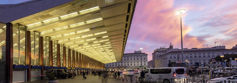 Alla fine degli anni Trenta, in vista di quella che doveva essere l’Esposizione Universale del 1942, si decise di dare un volto monumentale e grandioso alla “vecchia” Stazione Termini, inaugurata tra i campi e le vigne dell’Esquilino solo nel 1874. I lavori, diretti da Angiolo Mazzoni, furono però ben presto interrotti dalla guerra. Affidati a due nuovi gruppi di architetti, vennero quindi completati solo nel dicembre 1950, in un clima politico e culturale completamente mutato. Di quest’ultima fase è l’elemento forse più caratterizzante della stazione, la lunga pensilina in cemento, opera dell’architetto Montuori, che si protende oltre il volume vetrato delle biglietterie. Viste di lato, le sue linee sembrano riprodurre la coda, la schiena e il collo di uno dei grandi rettili della preistoria e così negli anni Sessanta fu soprannominata scherzosamente dai romani il “dinosauro”. La sua forma in realtà incornicia il profilo dell’Agger delle Mura Serviane, in una perfetta continuità fra antico e moderno. Del resto, il motto del progetto degli architetti che idearono la struttura era “Servio Tullio prende il treno”.