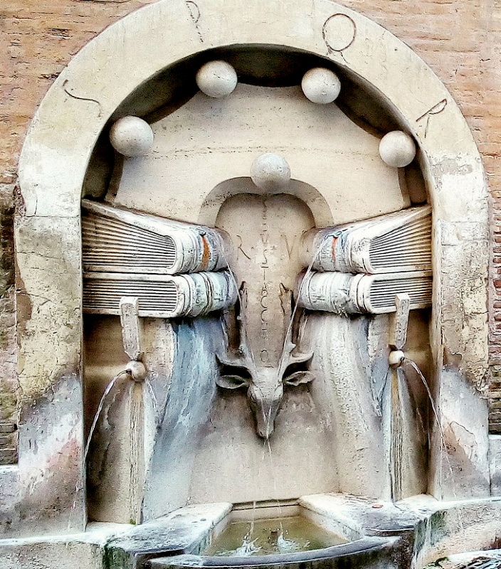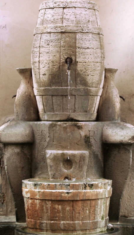Su via della Cisterna, nel cuore del Rione Trastevere, trovate questa originale fontanella che raffigura un caratello, nome che anticamente designava la botte usata per trasportare il vino. L’acqua sgorga dalla botte e viene raccolta in un tino e da due caraffe da un litro posizionate ai lati del fusto, oggetti tipici delle osterie romane. La fontana, infatti, simboleggia le numerose osterie e le trattorie che caratterizzano quest’area della città. Lo sapevate che ogni misura di vino aveva il proprio nome? Sospiro o sottovoce era il 1/10 di litro, chirichetto il 1/5 di litro, quartino il 1/4 di litro, fojetta il 1/2 litro e barzilai i 2 litri. Quest’ultimo prendeva il nome dal politico Barzilai che a fine Ottocento, durante le campagne elettorali, offriva il vino in recipienti da 2 litri.
