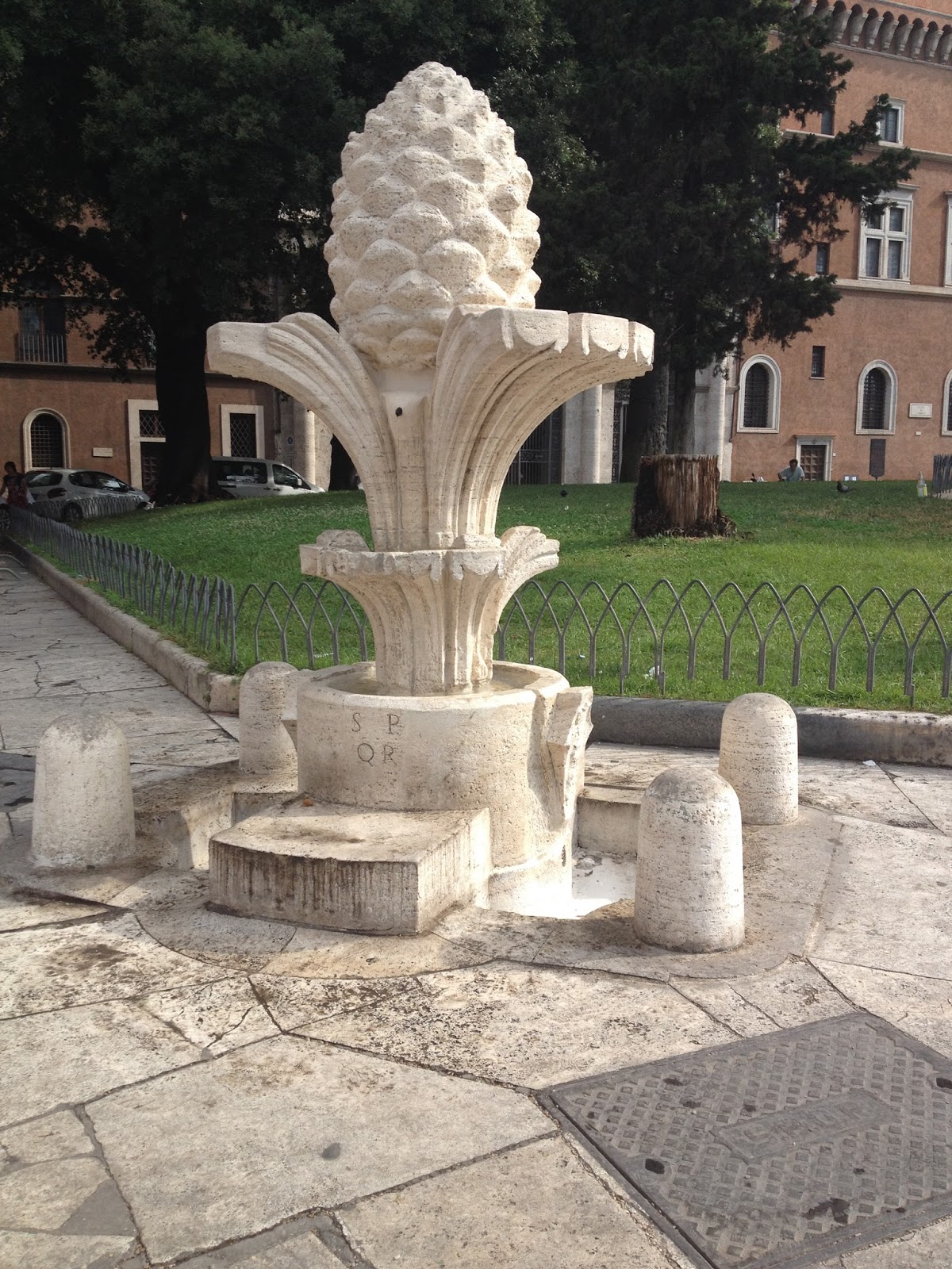 A piazza San Marco, la piccola piazza adiacente a piazza Venezia, si trovava un’enorme pigna in bronzo che diede il nome al Rione che la ospitava. Quella pigna fu in seguito trasferita in Vaticano, e oggi si trova, trasformata in fontana, nel cortile omonimo dei Palazzi Vaticani. Nel 1927, l’architetto Lombardi, per ricordare l’antico simbolo del rione, creò una raffinata fontana a forma di pigna in travertino. La fontana, da cui sgorga acqua potabile a disposizione dei cittadini e dei turisti che transitano nell’area, è collocata all’ombra dei i pini e delle palme che adornano la piazza, e sullo sfondo si può ammirare la bella Basilica di San Marco. Al centro di corolle di tulipani stilizzati, si erge la pigna del Lombardi la cui acqua sgorga in numerosi zampilli che si raccolgono nelle vaschette sottostanti, a creare un continuum con il lastricato del marciapiede. Quattro colonnine marmoree ne delimitano idealmente il confine.