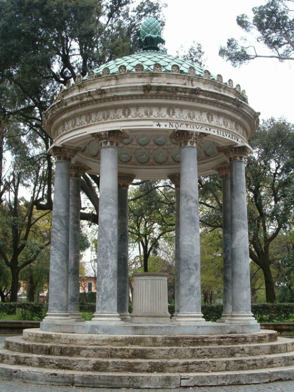 #5 Tempietto di Diana - Tra le terrazze, le statue, le fontane e i musei racchiusi negli 80 ettari di Villa Borghese, c’è anche un piccolissimo ed elegante tempio di forma circolare e in stile neoclassico. Attribuito ad Antonio Asprucci e al figlio Mario e datato 1798, fu fatto costruire dal principe Marcantonio IV Borghese, il più munifico mecenate della Roma del Settecento, che trasformò la villa voluta dal cardinale Scipione Caffarelli Borghese in un grande giardino alla moda. In questo caso a fare da ispirazione sono il Tempio di Vesta o il Tempio dell’Amore nel Parco di Versailles, modelli rielaborati con grazia e finezza: così, nonostante la scala ridotta e la semplicità delle forme, l’effetto scenografico è assicurato. Otto colonne di marmo bigio, che poggiano su quattro gradini circolari, sostengono una cupola sormontata da una pigna. All’interno, su un basamento ancora oggi presente, era posta una statua a grandezza naturale di Diana, una copia romana di un originale greco restaurata dalla bottega di Vincenzo Pacetti. La statua è oggi al Louvre: a ricordare la dea rimane l’iscrizione sull’architrave “NOCTILVCAE · SILVARVM · POTENTI”, alla dea della luce notturna, signora delle foreste.